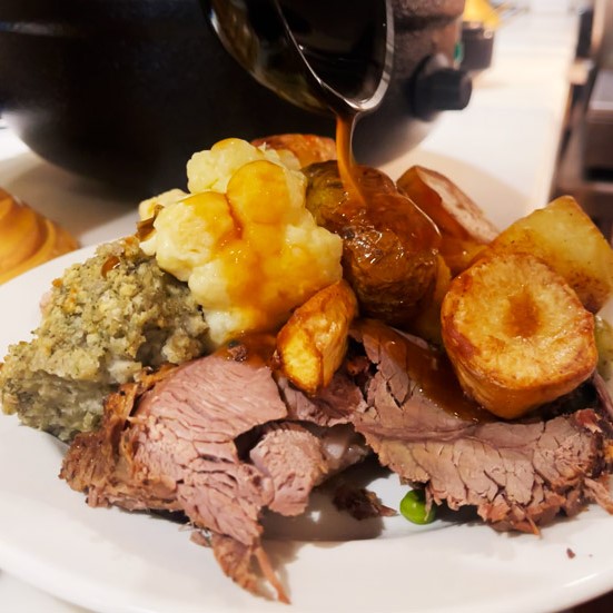 A selection of 2-3 delicious roasted meats and a vast selection of fresh vegetables and trimmings, including our famous homemade Yorkshire Puddings!